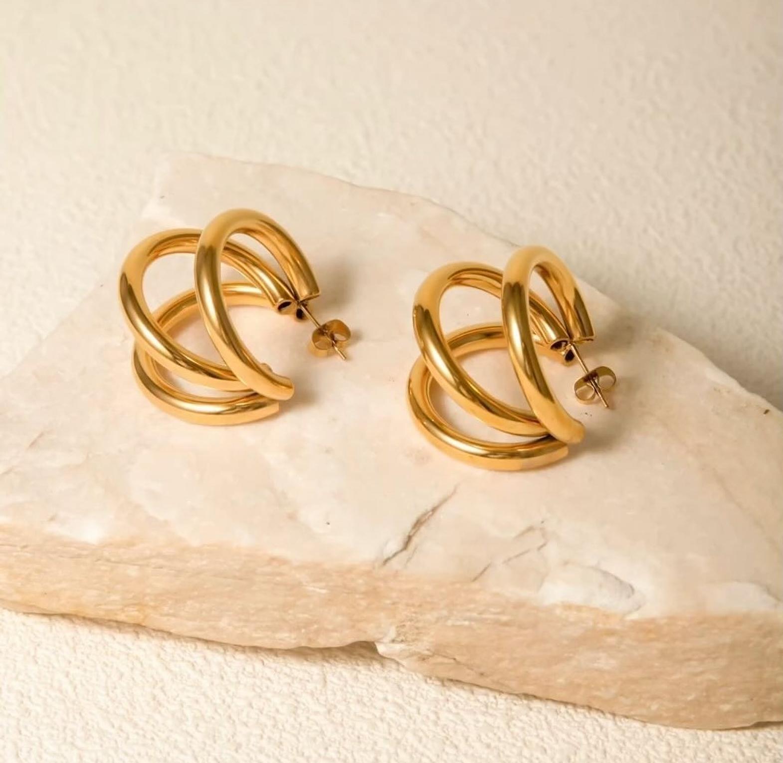 Versatile and chic, these 18k gold-coated triple-layered earrings are perfect for office wear or a party.