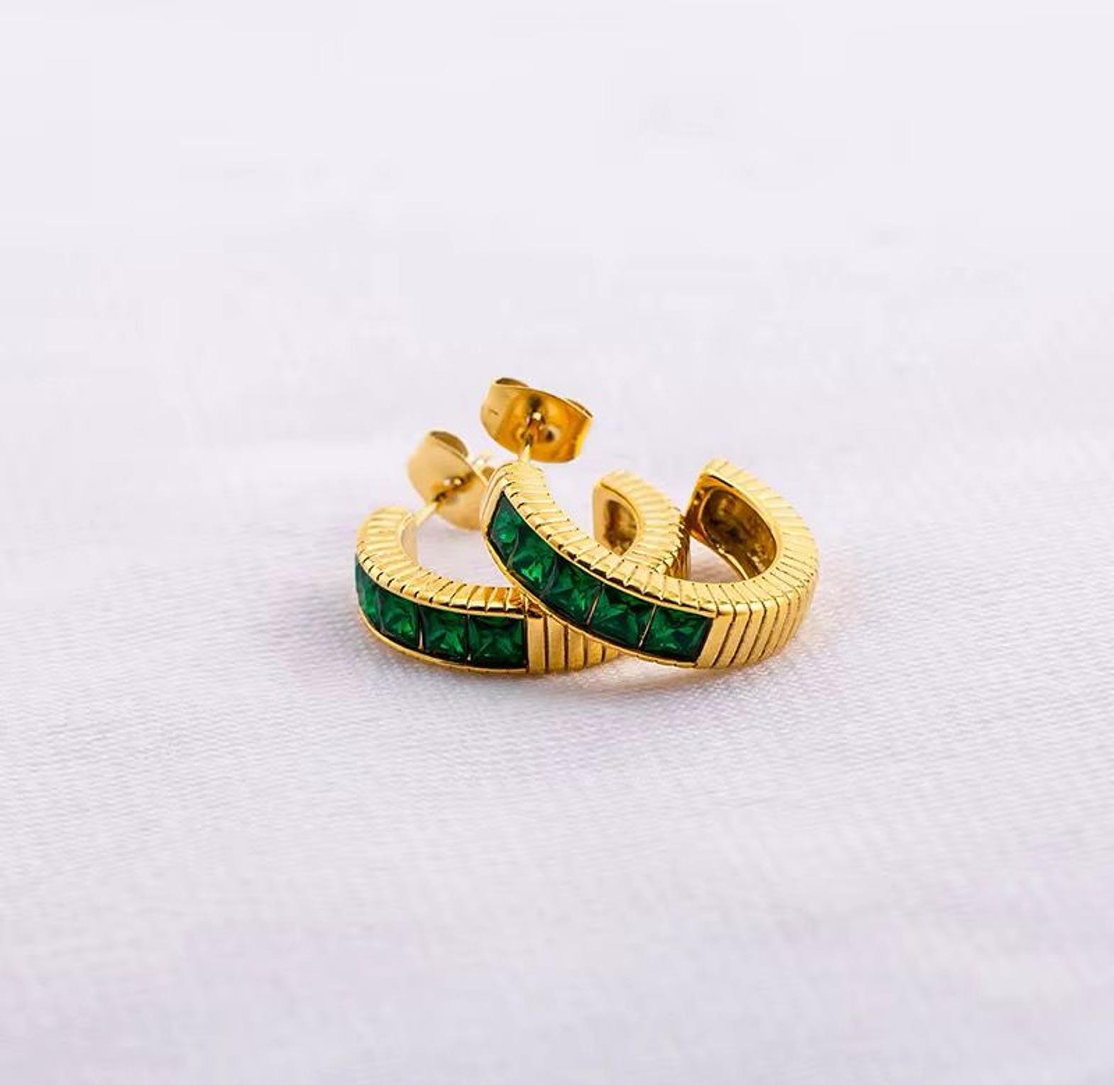 Elegant and timeless, these C-shape emerald earrings blend a sleek gold finish with vibrant emerald accents for a refined touch.